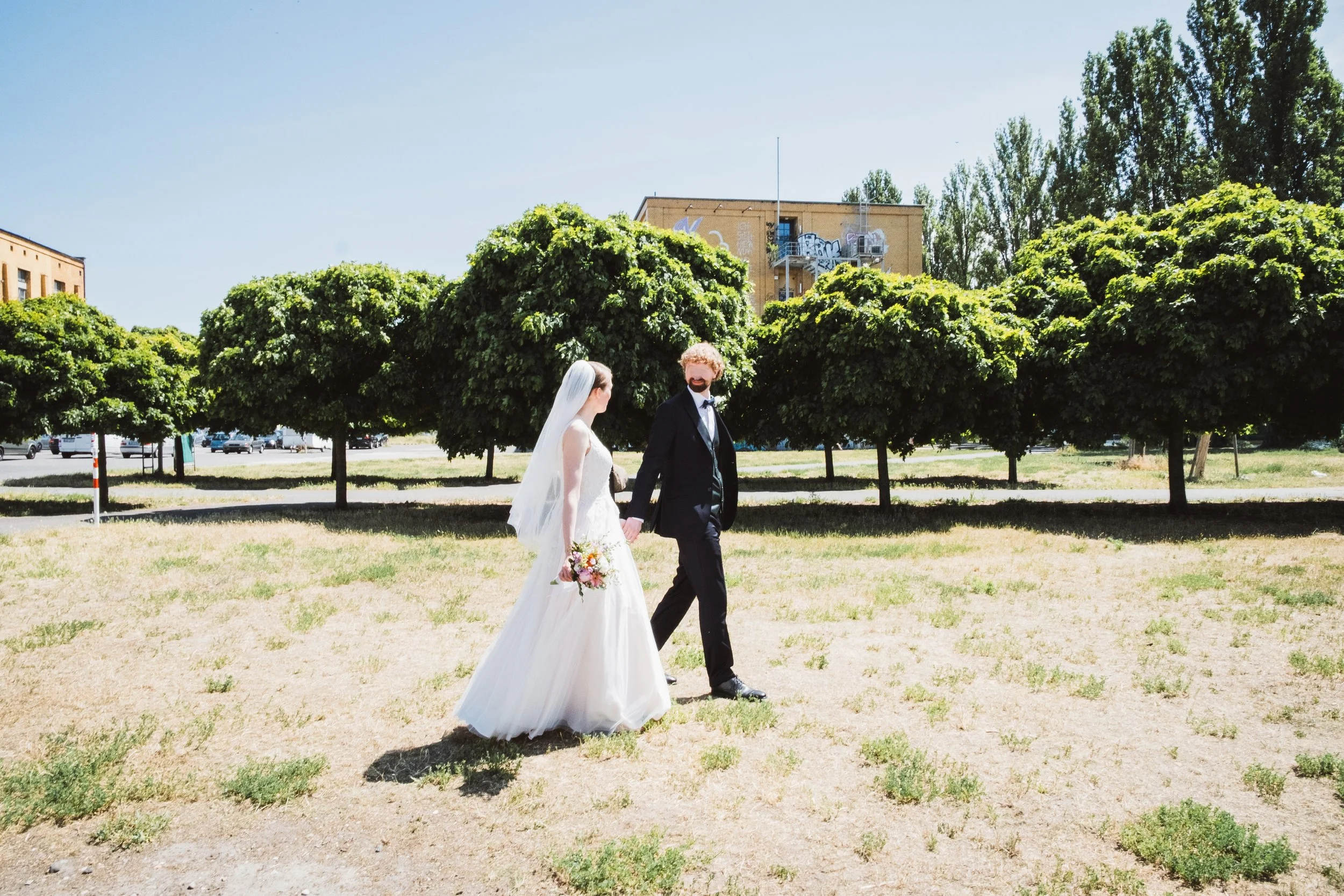 Als Hochzeitsfotografin schätze ich besonders die Vielfalt der Umgebungen an dieser Location. Ihr könnt euch zwischen orangefarbenen Backsteinfassaden, coolen gepflegten Innenhöfen und industriellen Details bewegen und wenige Schritte später auf der Wiese zwischen Bäumen am Spreeufer stehen. An der Parkfläche am Wasser könnt ihr Zweisamkeit am aufregenden Hochzeitstag genießen.