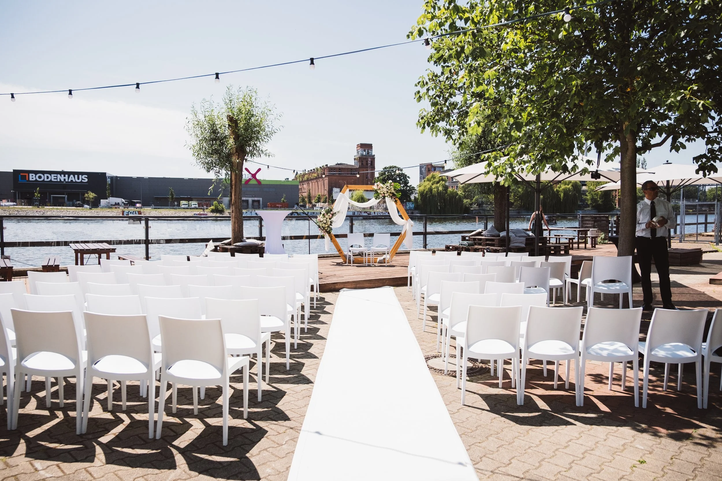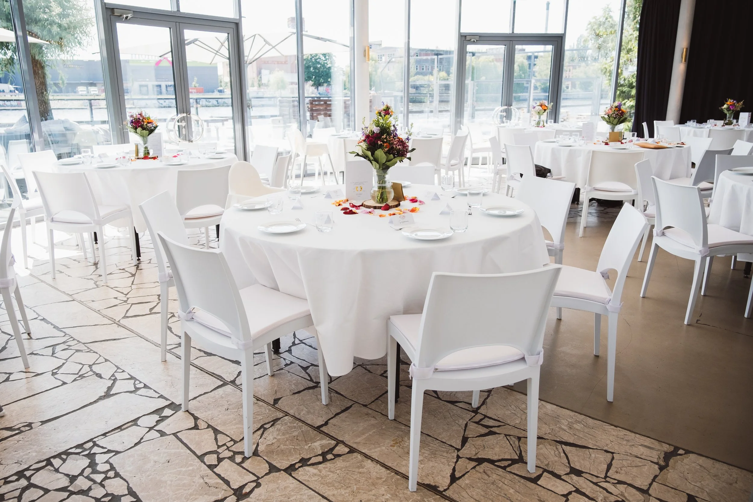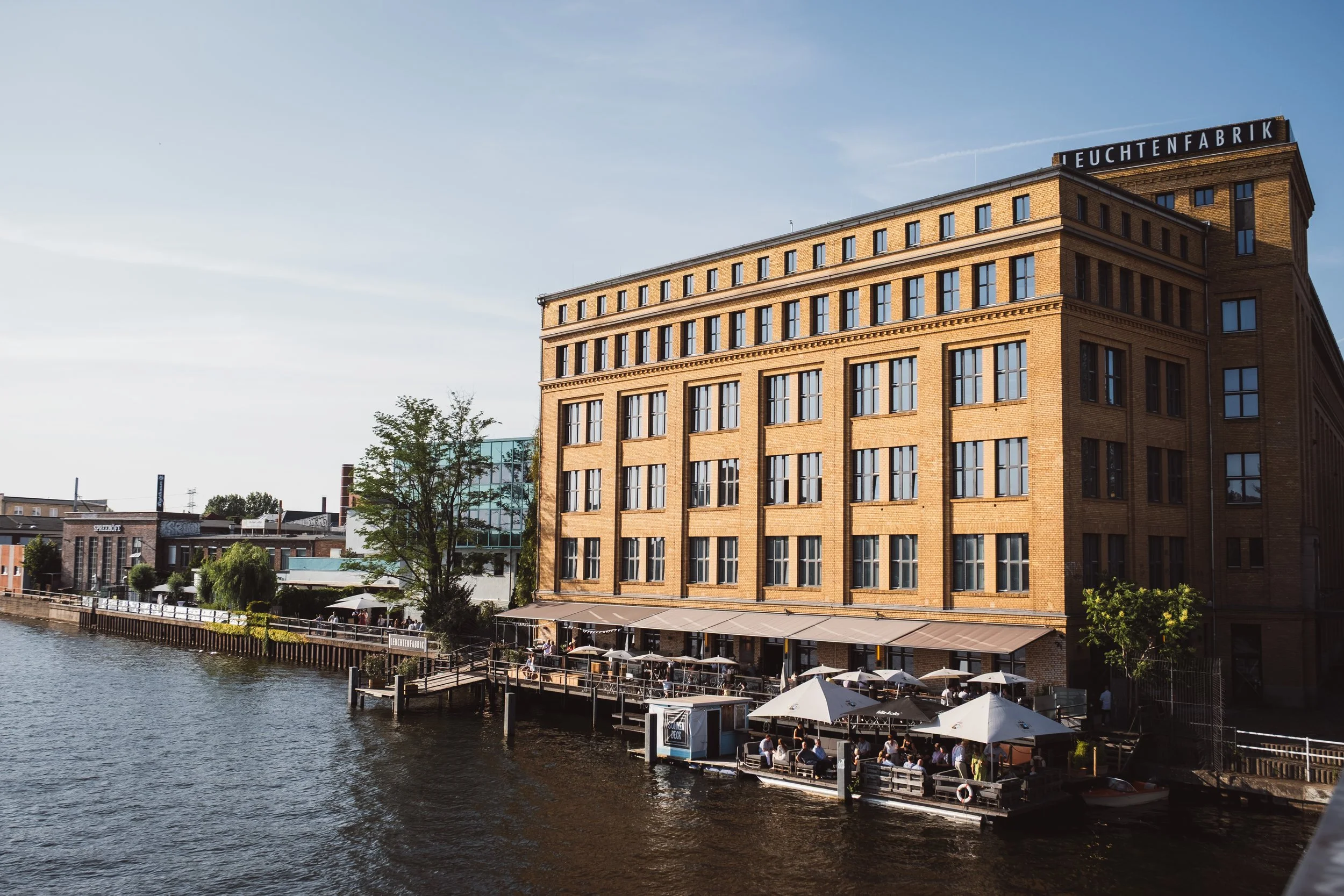 Alle Veranstaltungsflächen sind mit einer eigenen Spreeterrasse verbunden. Dadurch könnt ihr eure freie Trauung unter freiem Himmel planen, den Sektempfang nach draußen verlegen und später mit euren Gästen bei Sonnenuntergang mit Blick aufs Wasser feiern.