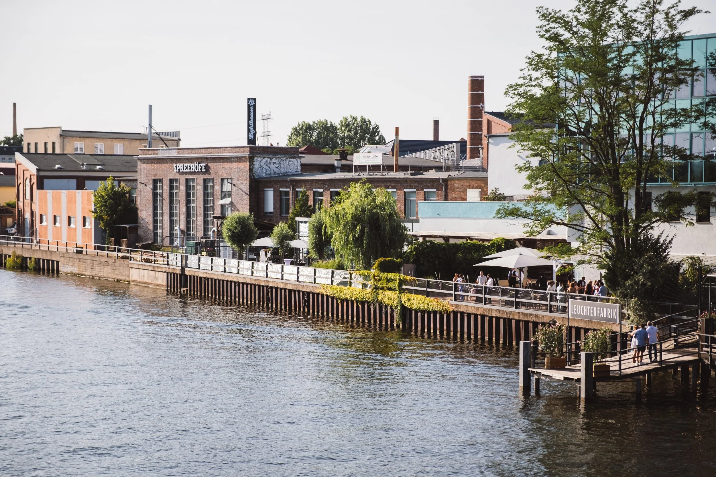 Heiraten in der White Spreelounge in Berlin-Schöneweide verbindet Wasser, Industriearchitektur und moderne Eleganz auf eine Weise, die es in Berlin nicht so oft gibt. Ihr feiert direkt an der Spree, empfangt eure Gäste auf einer eigenen Terrasse, plant eine freie Trauung mit Blick aufs Wasser und tanzt später losgelöst, weil ihr niemanden stören könnt.